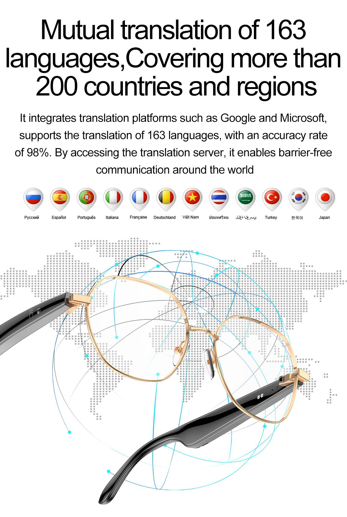 AI Bluetooth Audio Communication Fashion Smart Glasses: AI intelligent voice and video real-time translation, AI dialogue and Q&A, AI intelligent translation (translation machine mode, glasses+phone translation mode. Can translate more than 163 languages), voice note, sleep aid mode, photo translation, remote control photo, Bluetooth communication, intelligent Hall sensor automatic on/off, intelligent voice assistant, music playback (switching, pausing music appreciation), using low-power AB5712F chip, ENC noise reduction, ultra-low latency, long-lasting battery life, lightweight 25g, comfortable to wear, configurable sunglasses, blue light, close view and other lenses.