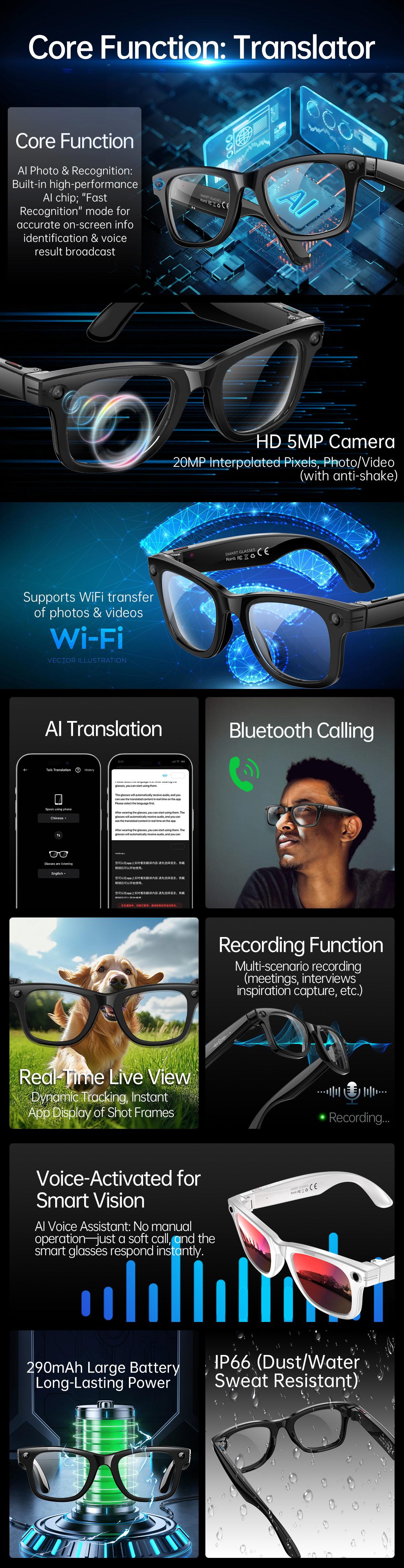 AI Camera & Video Smart Fashion Glasses: AI photo object recognition with answers, AI voice wake-up, AI intelligent Q&A interaction, and AI translation. It supports photography, video recording (with anti-shake function), and audio recording.