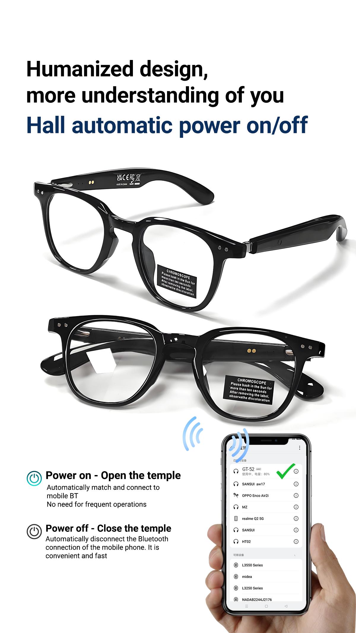 Main control chip:AB5636H Battery :50mAh+50mAh Charging way:Magnetic charging Bluetooth version:BLE5.4 Bluetooth protocol:A2DP,HFP Mode of operation:Touch Transmission distance :10M Waterproof level :Life waterproof Material :ABS+TR90 Voltage :DC5V Electric current:50mA*2 Play current (max volume):22mA Standby current :1mA Lens Material:Anti-blue light photochromic gray lenses lens Size :170*70*52mm Weight:Glasses35g + packing box 112g = 147g Outer box specifications :390*360*280mm 50pcs/8.2KG Language English Functions:Bluetooth calling/music playback/games/multi-style menu/voice assistant/weather/remote camera LENS EFFECT :Anti-blue light/Anti-glare Packing:Smart Glasses charging cable, storage pouch, cleaning cloth, user manual, packaging box