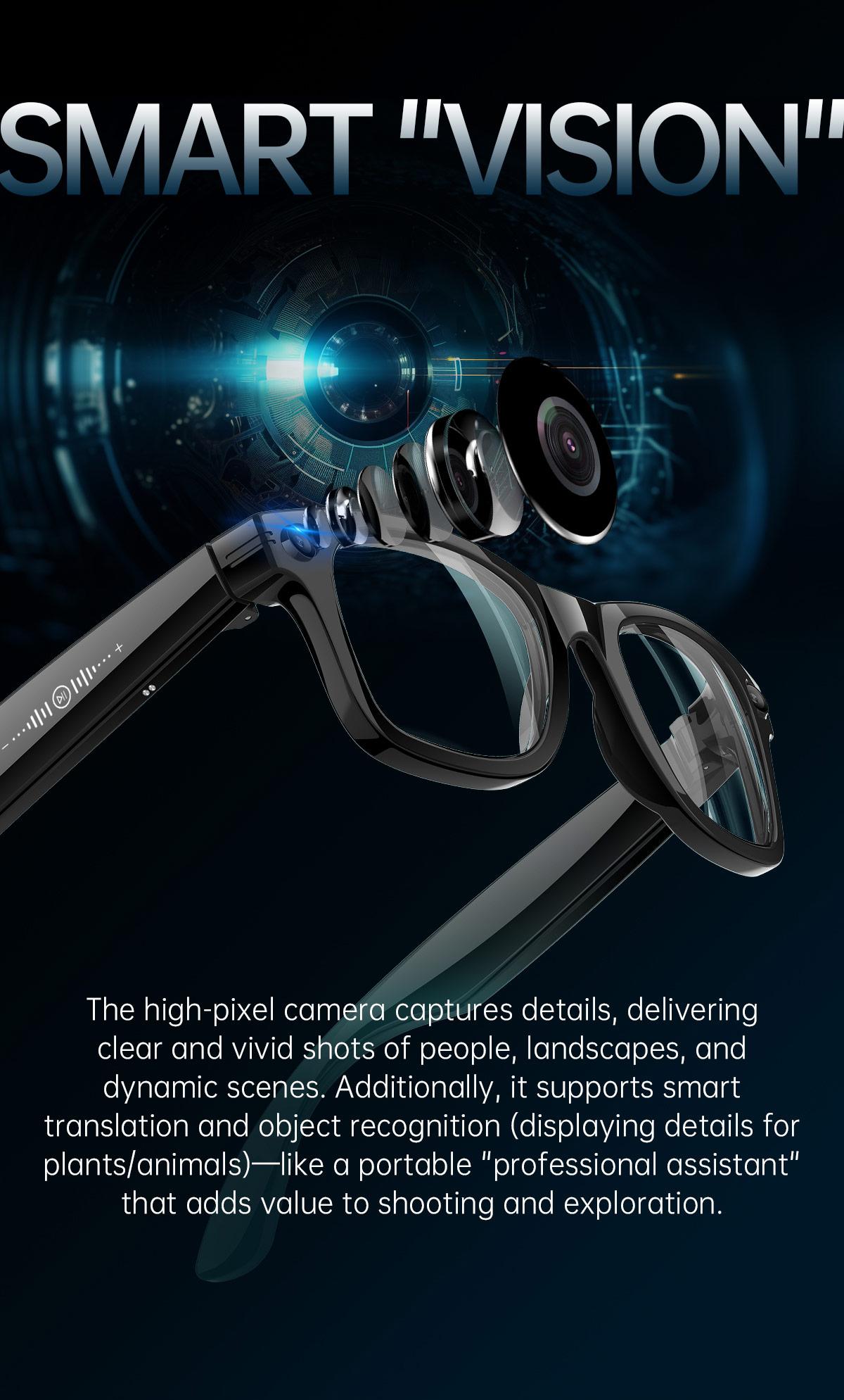 Product Model:W620 Function points AI Camera & Video Smart Fashion Glasses: AI photo object recognition with answers, AI voice wake-up, AI intelligent Q&A interaction, and AI translation. It supports photography, video recording (with anti-shake function), and audio recording. It can transfer photos, videos, etc. to mobile phones via WIFI. It features slide touch for volume adjustment and wear detection. Equipped with dual microphones with ENC noise reduction, it supports Bluetooth calling and music playback (with track switching and pause for music enjoyment). It adopts Jerry + Allwinner main control chips with low power consumption and low latency, ensuring long battery life. It offers convenient operation with two physical buttons plus slide touch, an ultra-light 37g design for a weightless wearing experience, and is configurable with various lenses such as sunglasses, blue light-blocking, photochromic, and myopic lenses. It has a 290mAh large battery and an IP66 rating for dust, water, and sweat resistance. APP: DA ECHO ⭐Master Chip:JL7018F ⭐coprocessor chip:V821L2 ⭐camera:5MP (with interpolated imaging pixels up to 20MP) ⭐Memory storage:4GB(bit:32G) ⭐WIFI:Support WIFI transmission of photos, videos, and recordings ⭐debounce:Support Optical Image Stabilization (OIS) ⭐Touch:Adjust volume with sliding touch + single touch ⭐Dual microphones:ENC dual-microphone noise reduction and anti-interference ⭐voice wake-up:Support ⭐Special Features:AI photo recognition, AI intelligent Q&A interaction, photography, videography, recording ⭐Waterpfoof Level:IP66 rating for dust tightness, water resistance and sweat resistance