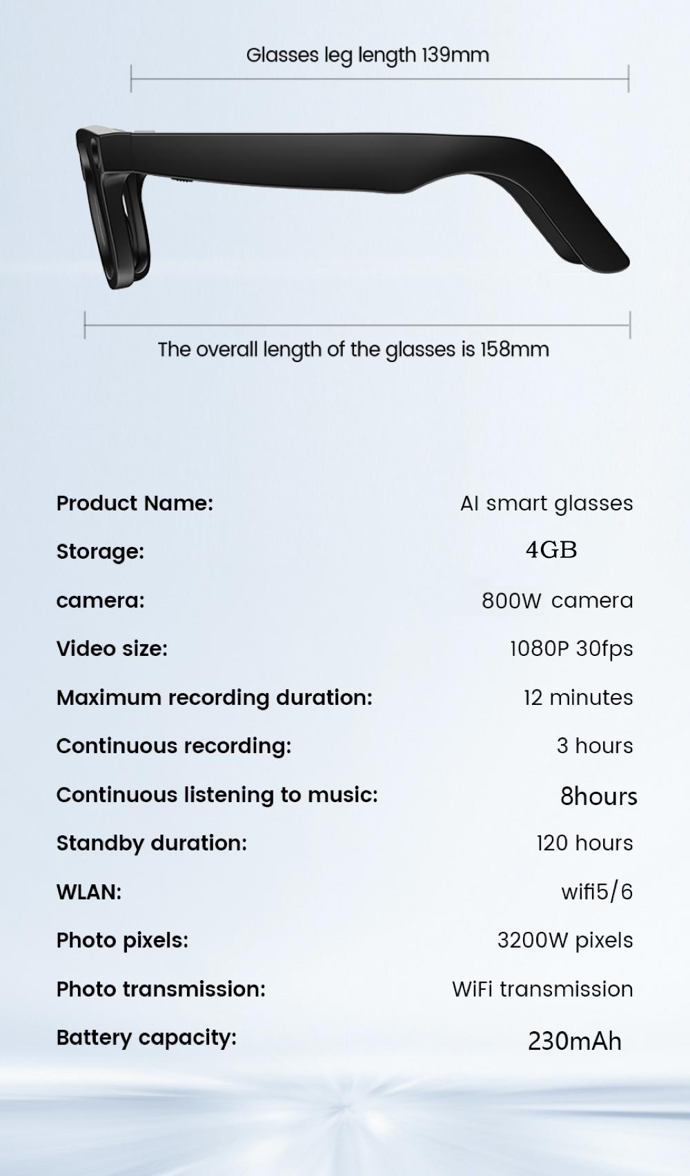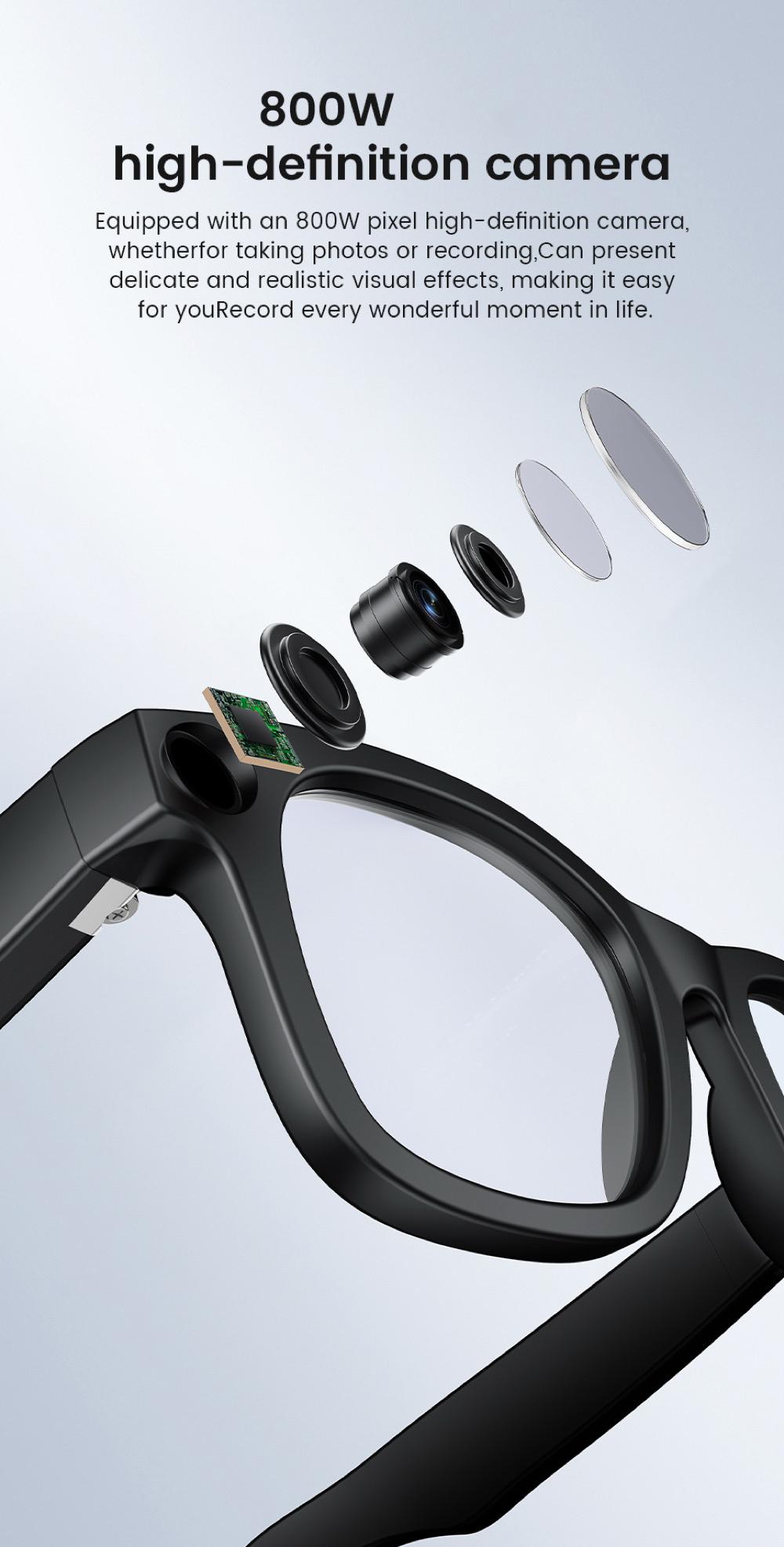 1.chip:JL7018F. 2.Battery:230mAh. 3.Charging Port:2-pin magnetic fast charging. 4.Camera:800W. 5.Video:1080P 30 frames. 6.Speaker:Dual HIFI Bass speakers. 7.Photo/Video:support Wi-Fi transmission. 8.Anti-Shake:Software anti-shake algorithm. 9.Chipset for Camera:V821.