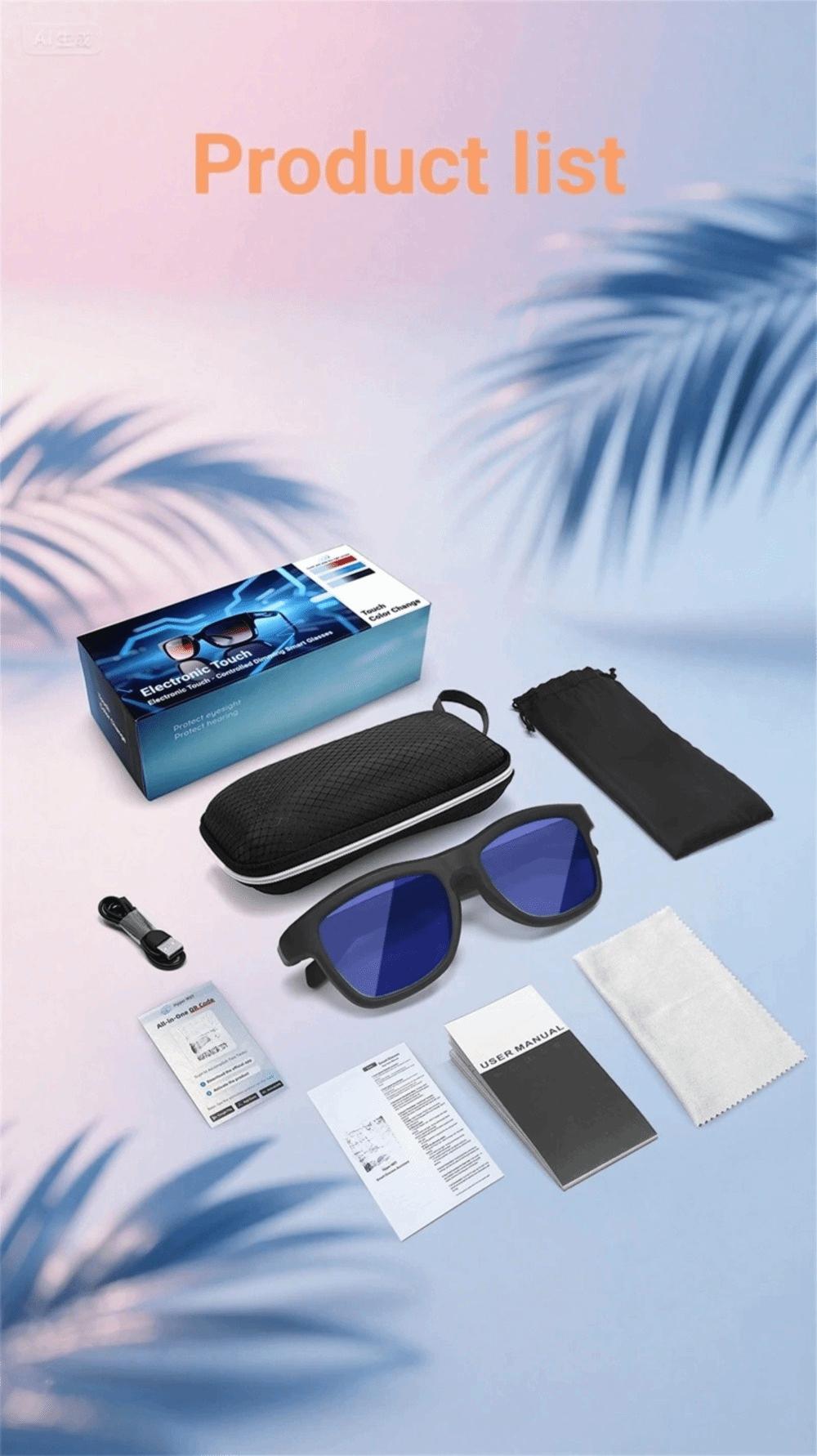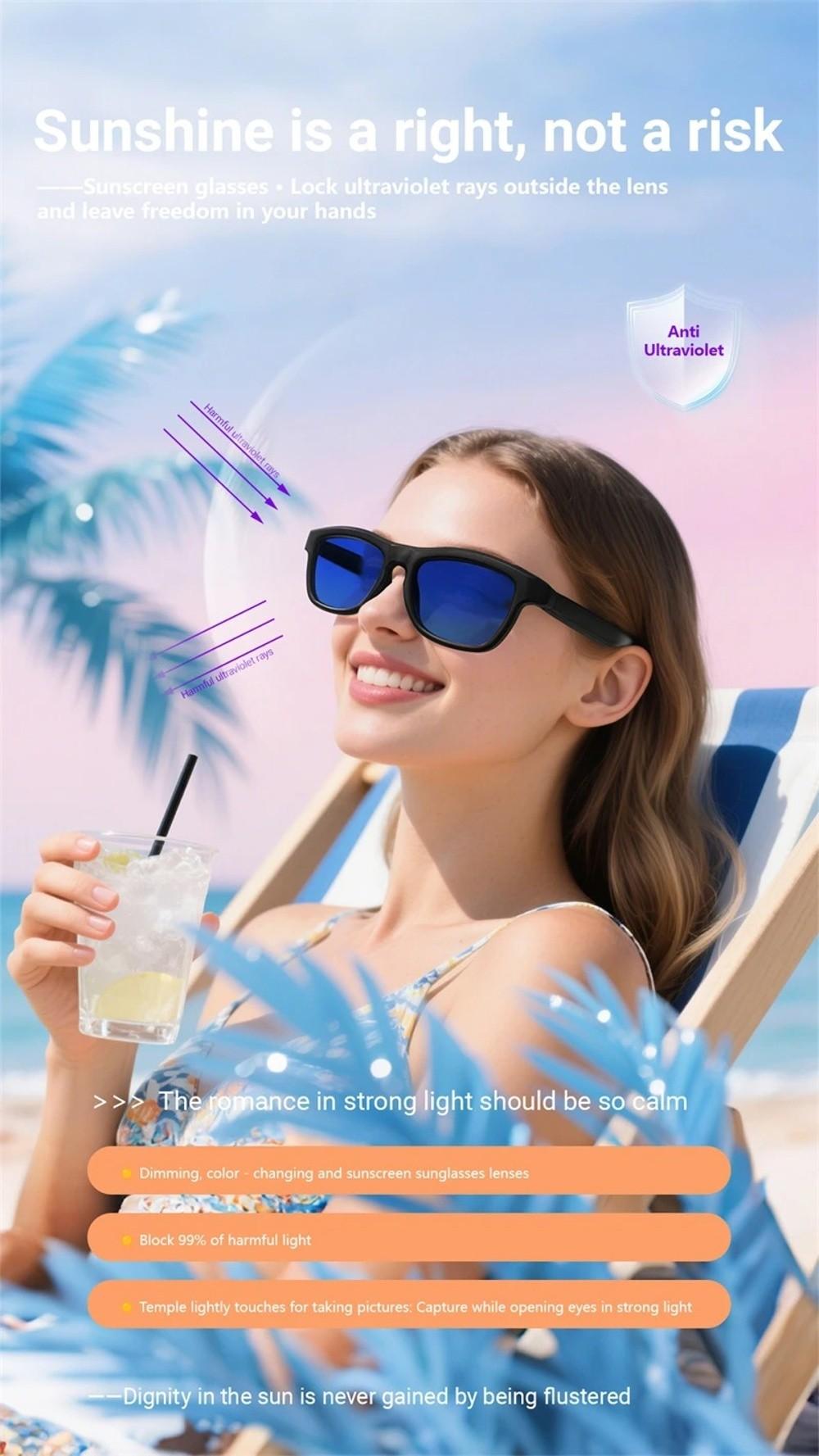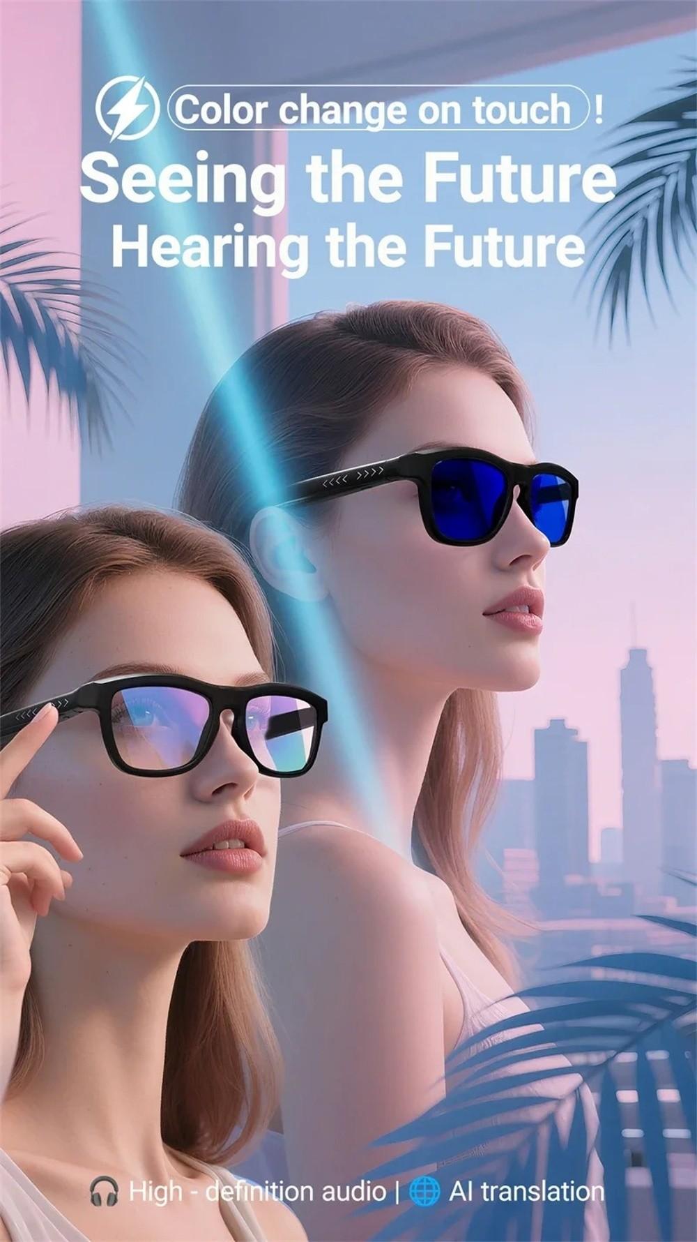 :Smart Dimming and Color-Changing Glasses Functions:Bluetooth call / Music playback / Voice assistant / Remote control photo taking / AI translation Lens material: Glass LCD lens Size:As shown Lens Effect:UV protection / UV400 / Anti-glare Use Case:Drive/FishingTravel/Businesst/Daily Package included: 1 set Smart Bluetooth Sunglass Specifications: Main control chip:AB5632B Battery:150mA Charging way:Magnetic charging Bluetooth version:BLE5.4 Bluetooth protocol:A2DP;HFP Mode of operation:Button Transmission distance:10M Waterproof level:Life waterproof Material:ABS+PC Voltage:DC5V Electric current:120mA Play current (max volume):38mA Standby current:6mA Lens Material:Liquid crystal glass lens Language:English Function Introduction: 1.Audio system: Equipped with surround sound headphone speakers (concealed open headphone speakers + composite membrane speakers), providing an excellent audio experience and seamless switching of tracks, calls, and ambient sound. 2.Lens function: Eye care blue light protection, relieve eye fatigue, high-definition transparency. Equipped with an intelligent polarization function, it can counteract reflections from water, snow, and glass, prevent ultraviolet rays, and resist fatigue. 3.Control method: It can activate functions through ultra ultra-sensitive touchpad and a shooting button. 4.Battery life: Equipped with a 150mAh lithium battery, it can be fully charged in 45 minutes and can be used continuously for 15 hours. It can meet 15 hours of music listening and 15 hours of voice calling. 5.APP adaptation: You can easily manage photos and videos through the APP, and download and export them to your phone with just one click via WiFi transmission. Functional features: Music playback: supports intelligent music recommendation and high fidelity playback. Voice recording: With precise voice recognition and transcription functions, it can record conversations in real time and efficiently organize them. 6.Photography stabilization: Customize the EIS algorithm to achieve ultra-stable stabilization, with a high-speed shutter response of 0.8 seconds for capturing. Note: Due to different lighting and screen settings, the item color may be slightly different from the picture. Due to different manual measurements, please allow a 1-2cm difference in size.
