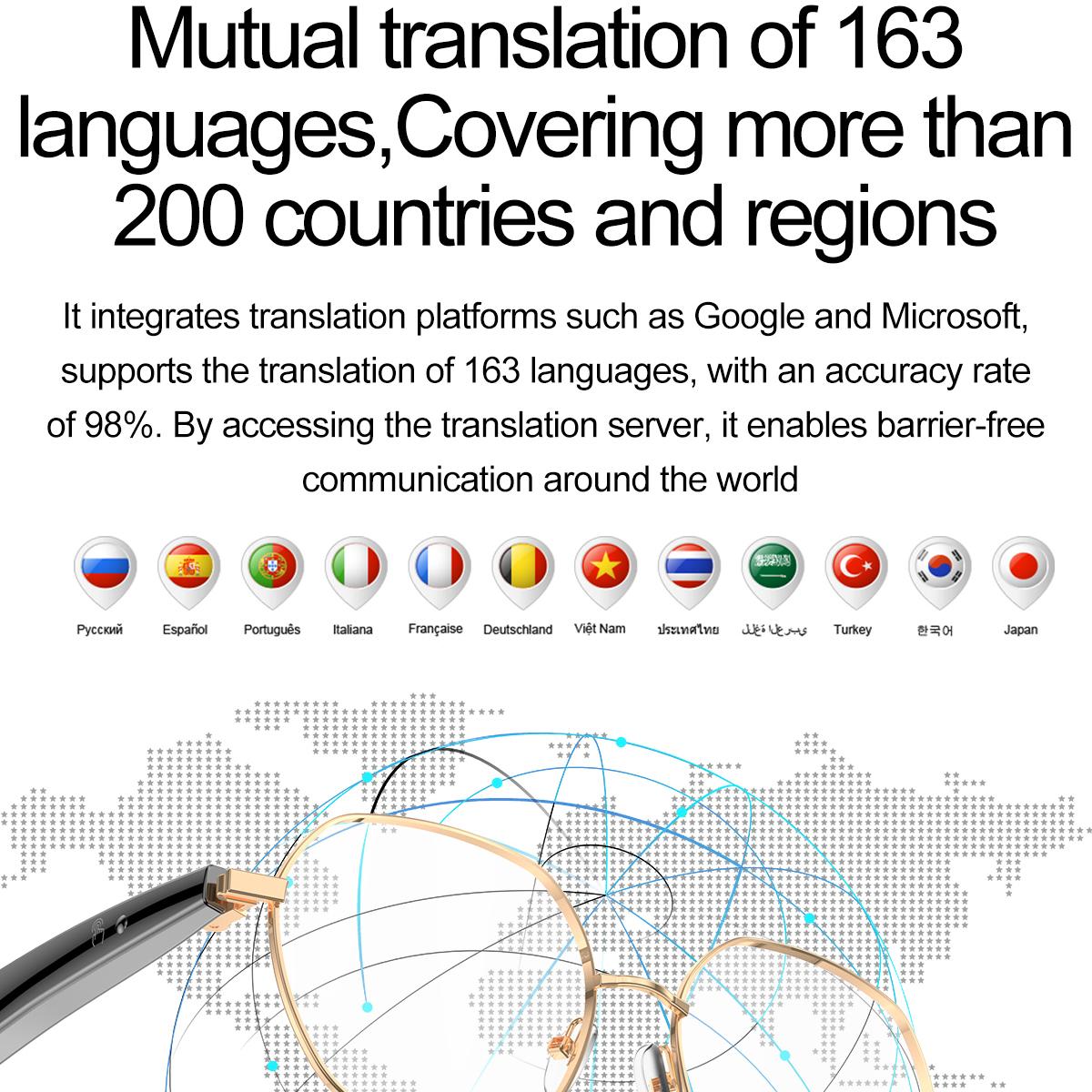 AI Bluetooth Audio Communication Fashion Smart Glasses: AI intelligent voice and video real-time translation, AI dialogue and Q&A, AI intelligent translation (translation machine mode, glasses+phone translation mode. Can translate more than 163 languages), voice note, sleep aid mode, photo translation, remote control photo, Bluetooth communication, intelligent Hall sensor automatic on/off, intelligent voice assistant, music playback (switching, pausing music appreciation), using low-power AB5712F chip, ENC noise reduction, ultra-low latency, long-lasting battery life, lightweight 25g, comfortable to wear, configurable sunglasses, blue light, close view and other lenses.