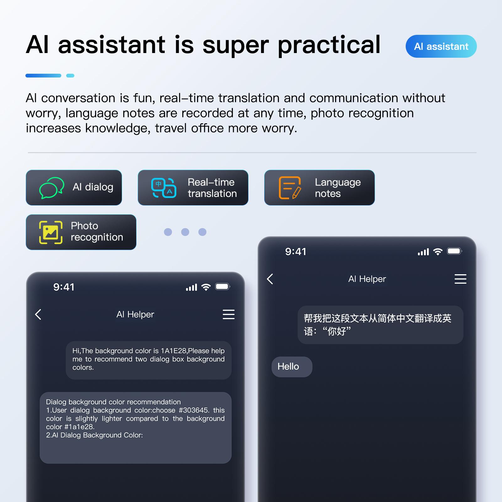 AI photo recognition and question answering, photo taking, video recording, audio recording, local music AI dialogue and intelligent interaction. The app can transfer images via Bluetooth and save them locally, with ultra-low power consumption (supporting continuous recording for over 2 hours without overheating).